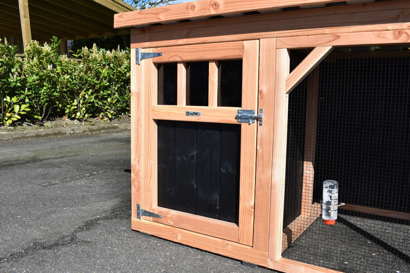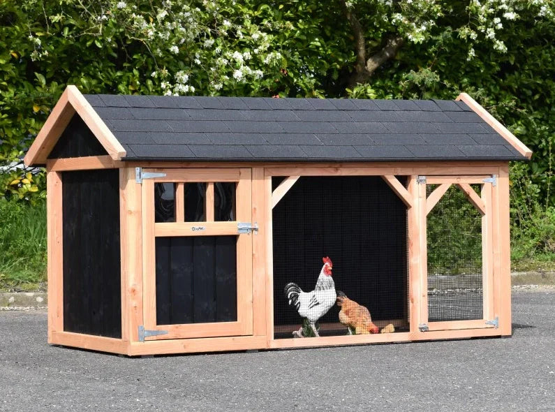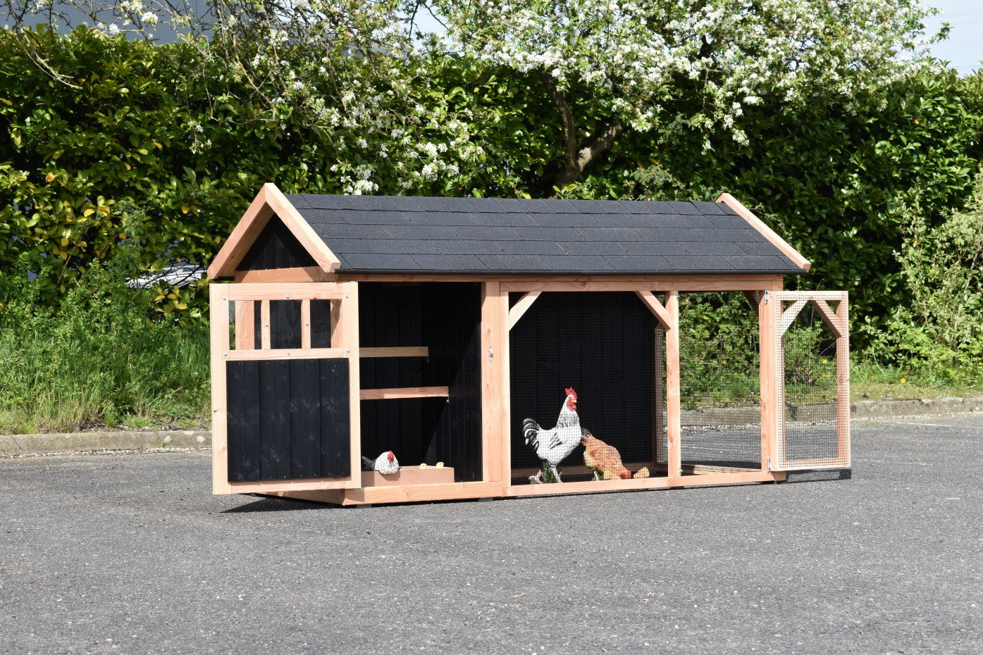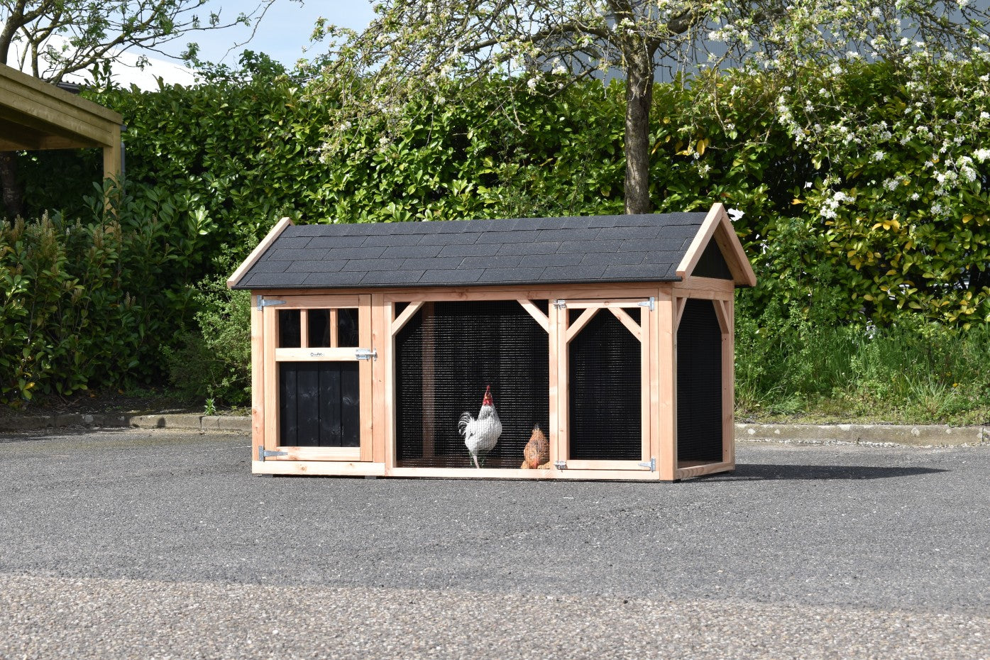 El Gallinero Mignon con techo en punta es un gallinero hermoso y robusto con un amplio recorrido. Está equipado con malla en la parte frontal y en los laterales. El techo sobre el parque ofrece a las gallinas un refugio suficiente contra el viento y las inclemencias del tiempo. El gallinero cubierto cuenta con un suelo de madera de abeto Douglas y una puerta espaciosa. Está fabricado internamente con materiales de alta calidad, lo que lo hace muy resistente y sin necesidad de mantenimiento.